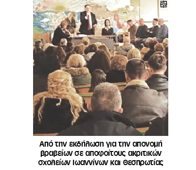 - Βραβεία και φέτος στους μαθητές ακριτικών σχολείων Ηπείρου — Σε 82 ανέρχονται οι μαθητές και οι απόφοιτοι ακριτικών σχολείων της Ηπείρου που βραβεύτηκαν φέτος σε εκδήλωση που διοργάνωσε το ίδρυμα «Μόρφωσις Νεολαίας» της Πανηπειρωτικής Συνομοσπονδίας Ελλάδος (ΠΣΕ). Οι μαθητές πηγαίνουν σε σχολεία των… (ΤΑΧΥΔΡΟΜΟΣ ΑΡΤΑΣ)